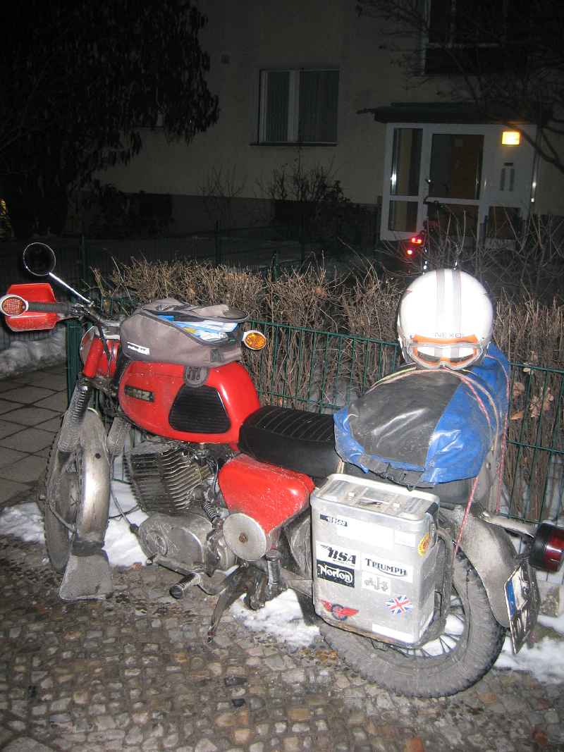 Draußen an der MZ zurück, vesperte ich noch fix eine Kleinigkeit - der Tee war gar immer noch warm! Dampf stieg aus dem Becer, der aber im Nu vom eiskalten Wind fortgetragen ward. Dieser kalte Wind sollte uns auch die nächsten Tage in Berlin erhalten bleiben.