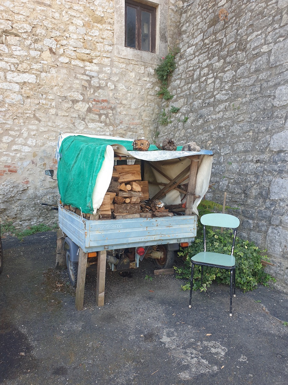 Ein typisch italienisches "Holzlager": Eine ausrangierte Ape, gut beladen und daher pittoresk, aber wahrscheinlich statisch nicht hilfreich aufgebockt. Stehen tut sie dort noch, weil der Ape noch niemand gesagt hat, dass die Statik nicht stimmt ...