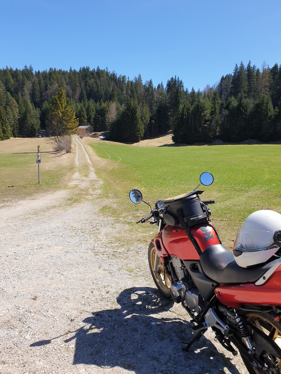 Dann runter nach Mittenwald. Eigentlich eine schöne und kurvige Strecke, wenn denn nicht das vorherfahrende Auto eines der Polizei wäre. So also staatsbürgerlich wertvoll verhalten und über Scharnitz wieder Tirol erreicht. Hinter Gießenbach bin ich aber gleich wieder rechts abgebogen und bin der wunderbaren Straße durch das dortige Hochtal nach Seefeld gefolgt.