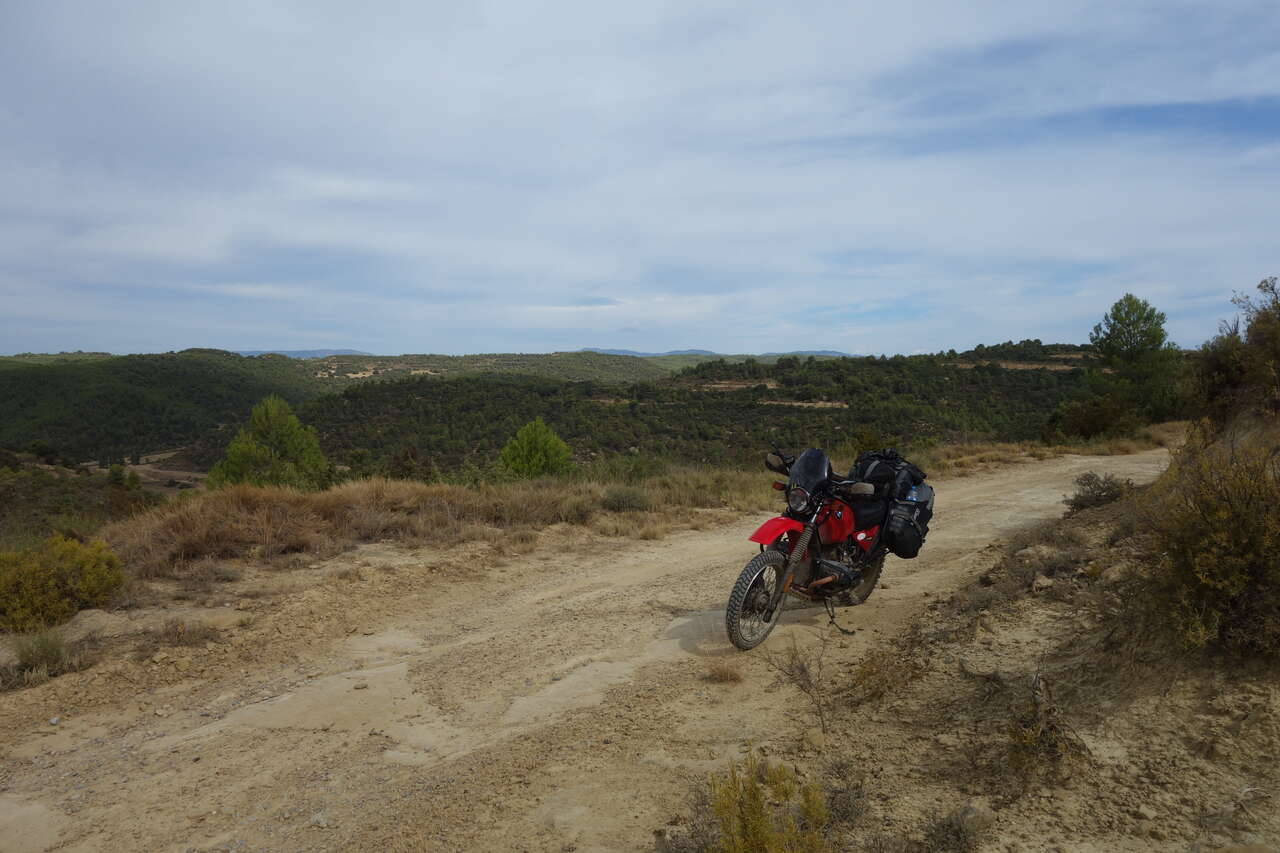 Nach einer Weile kam an einer Abzweigung besagtes Schild, kein Problem, ich bieg vom TET ab und fahr weiter auf Schotter, davon gibt es hier viel. Apropos: das ist hier ansich erlaubt, aber nur mit 30km/h und nicht „in sportlicher oder wettbewerbsmäßiger Absicht“. Ich halte mich halbwegs dran, mehr lässt die kurvige und unübersichtliche Strecke auch nicht zu. Und so hoppel und fahre ich, auf den Weg konzentriert, zu sehen gibt es sonst auch nicht viel. Irgendwann schau ich an einer Abzweigung aufs Telefon mit der Strecke und mich grinst rechts nurnoch der Stumpf vom Rückspiegel an. Abgefallen, einfach so...
