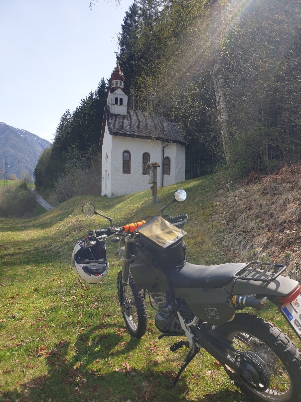 Nach lustigem Schwingen über die komplett leere (!) Brenner-Bundesstraße habe ich an der Grenze nochmals getankt und - viel wichtiger! - zwei volllkommen ungesunde, total unvegane, aber erprobtermaßen wohlschmeckende Leberkässemmeln erworben. Solcherart ausgestattet ging es über Sterzing bis nach Freienfeld. Dort dann rechts ab nach Stilfes und die kleine rechts des Eisack verlaufende Straße Richtung Mauls. Kurz vor der Abzweigung steht eine kleine Kapelle, bei der a) schöne Aussicht ist und b) Tische und Bänke sind. Leberkäs-Semmerl-Ort quasi ...