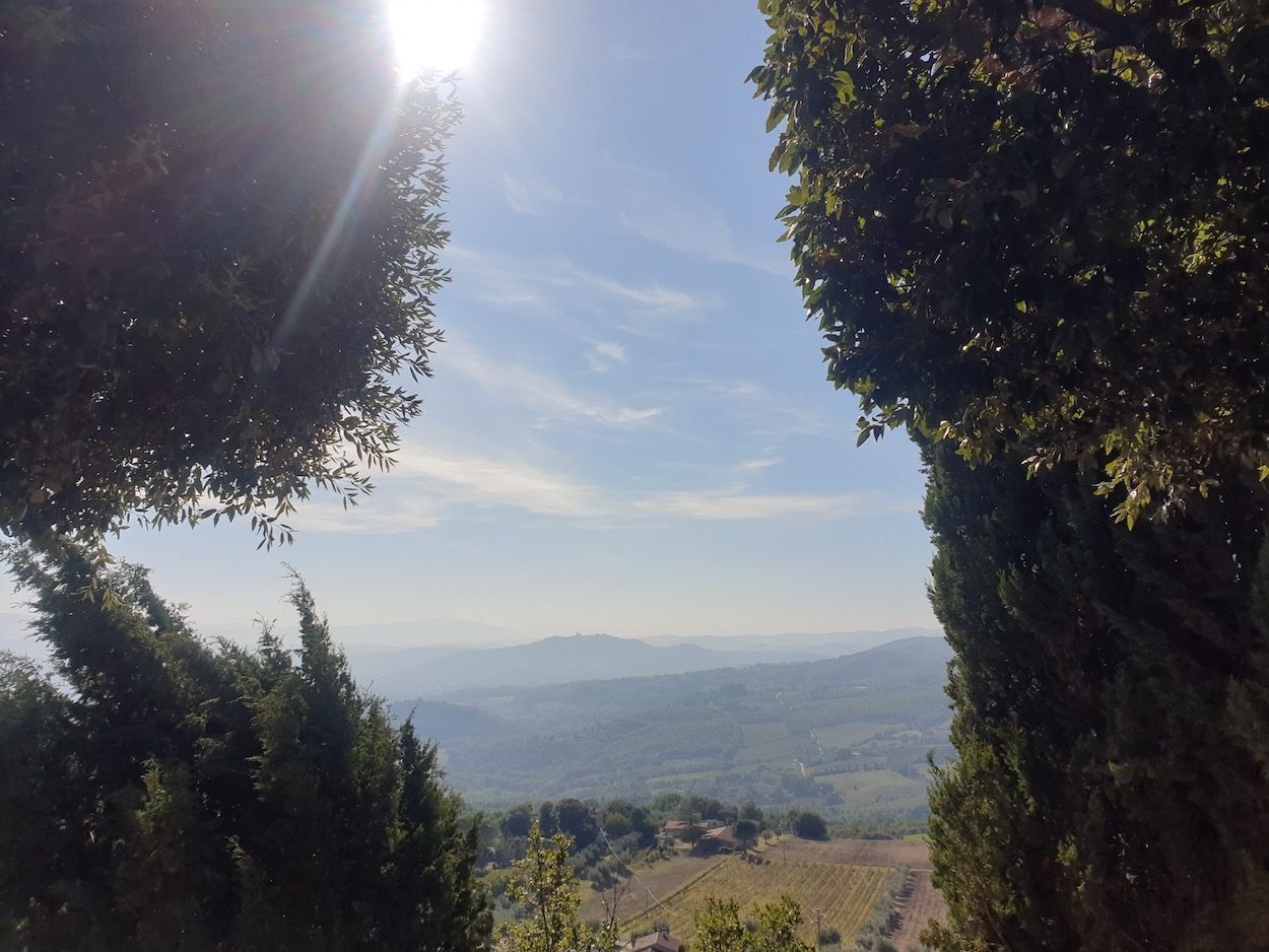 In Monteleone ging es dann wieder seitlich ab in hügeliges und weitgehend unbewohntes Gelände. Ruhige Abendstimmung, weiter Blick, unheimlich viel Vogelgezwitscher - einfach Balsam für die geschundene Seele. Und weil ich noch ein wenig Zeit hatte, habe ich mir noch Montegabbione angesehen, den Hauptort.