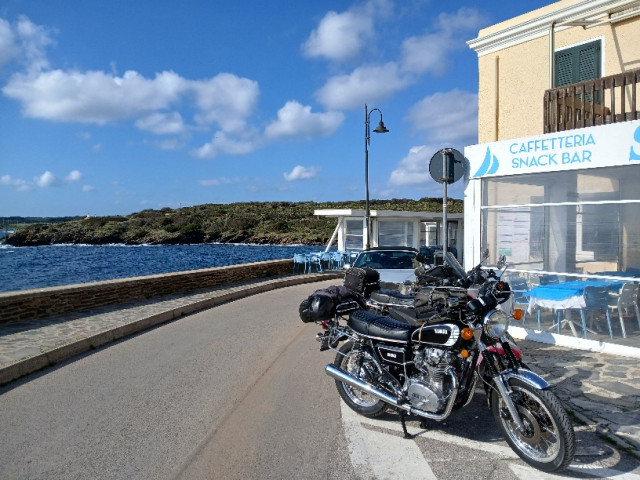 Die Fähre legt nur leicht verspätet an und wie üblich beginnt das Gewürze auf den Parkdecks. Egal, wir schlängeln uns durch und kommen gut runter. Weil der Frühverkehr in Genua nur wenig lustig ist, werfen wir uns kurz auf die Autobahn bis Bolzaneto, auch deshalb, weil wir dort in der Bar "Margherita" bei Luca Caffè und Focaccia genießen. Das ist immer wieder toll in diesen "Stadtteilzentren" namens Bar: Das wird eifrig parliert, Motorräder werden betrachtet - grad schee is'!