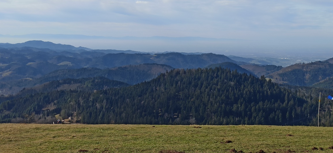 Nach dem Ruhestein zweigt der Weg Richtung Zuflucht/ Oppenau ab. Auch dieses Sträßlein zwirbelt sich wild zur Rheinebene runter. Ich fahre allerdings nur bis zu einem Parkplatz an einem Hang mit überragender Aussicht, von wo im Sommer unzählige Gleitschirmflieger starten. Denen scheint es aber noch zu kalt zu sein.