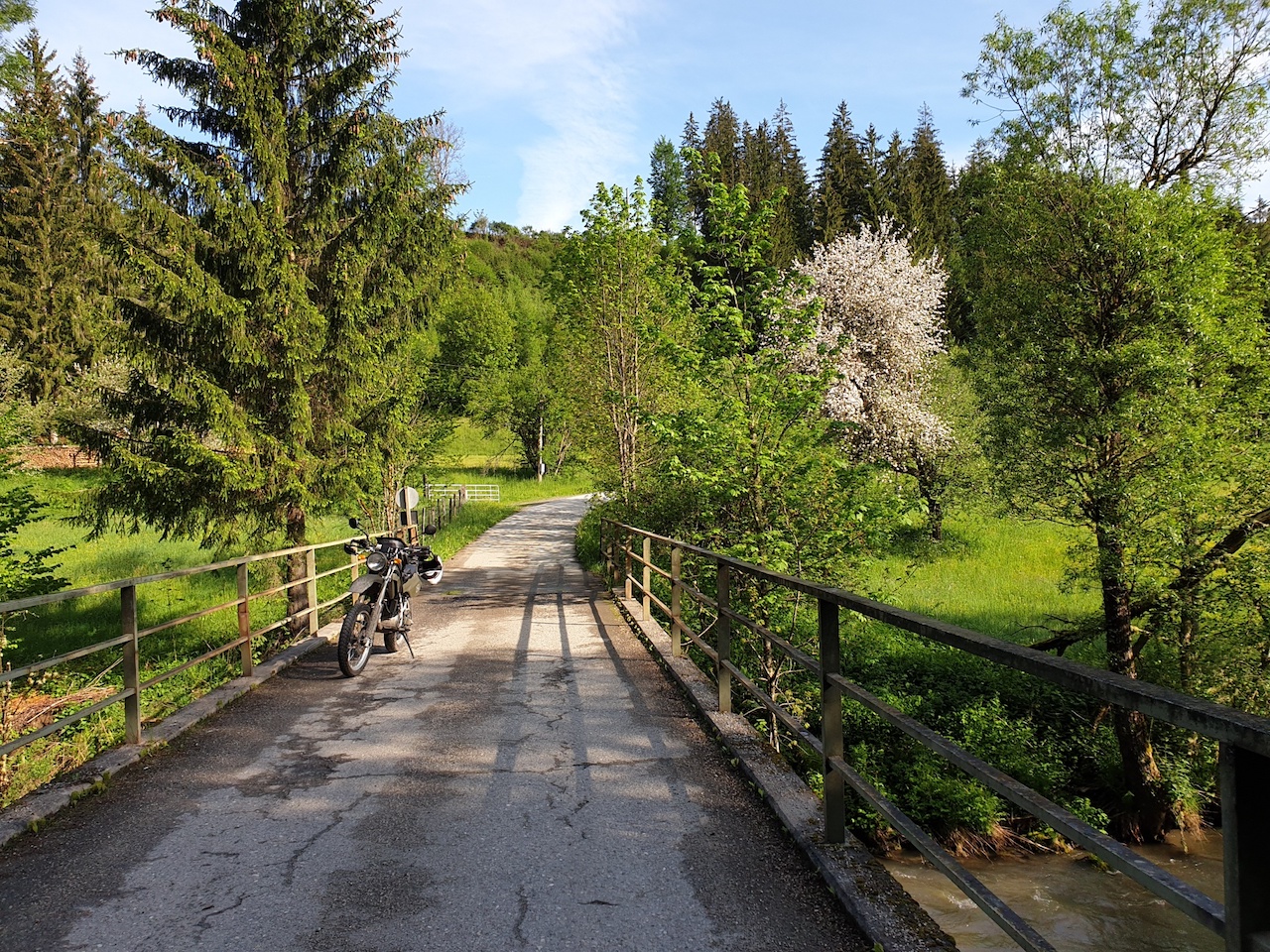 Dann das Metnitztal nach Westen, die Flattnitzstraße runter, um schon bald nach Deutsch Griffen hinaufzufahren. Dort war dann auch Reserve angesagt, aber es ging ja nach Sirnitz wieder bergab. Aber: auch in Sirnitz keine Tankstelle, also sparsam fahrend weiter über eine wundervolle Schotterstraße nach St. Leonhard. Dort überholte ich einen Stuttgarter Skoda ( leider Diesel) und schon bald darauf eine wartende GS: die Ehefrau musste dem Endurofahrendem Mann mit PKW folgen. So wie sie sich über die Piste gequält hat, möchte ich mir die abendlichen Gespräche gar nicht vorstellen ...