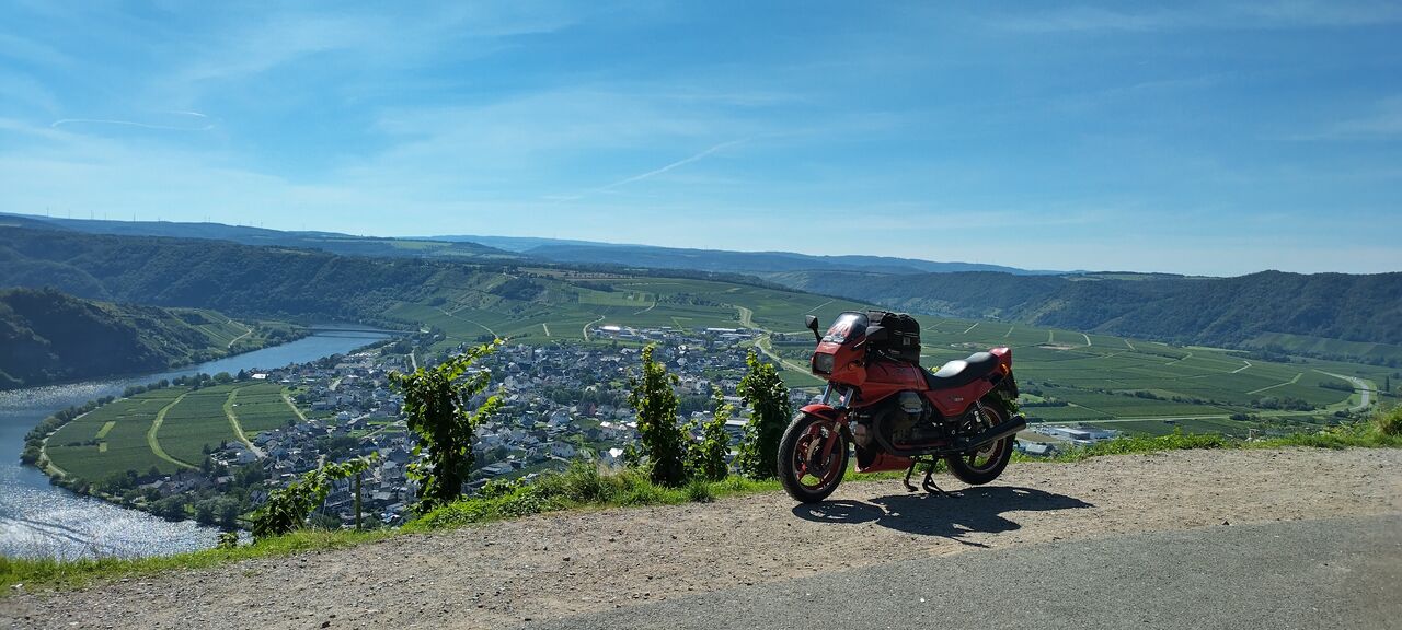 Einmal in Bewegung, fährt sich die Guzzi herrlich unaufgeregt! Das Fahrwerk ist ein einziger Traum! Die Bremsen packen ordentlich zu, an die Integralbremse kann man sich echt gewöhnen. Nur der Vorderradbremshebel hat quasi Null Betätigungsweg und fühlt sich an, als ob man an einem Stock rumdrückt. Nur mit wirklich viel Kraft bekommt man eine nennenswerte Bremswirkung zusammen. Viel Bremsen muss man allerdings ohnehin nicht, nach einer Weile stellt sich ein runder Fahrstil ein, das Fahrwerk lenkt ein, sobald man mit einem Druck auf die kurveninnere Raste und einer leichten Arschbewegung die Richtung vorgibt. Nie habe ich auch nur den Ansatz von Unruhe beim Durchfahren einer Kurve verspürt. Richtung einstellen, am Gas bleiben, durchfahren. Fertig. Leider geil!