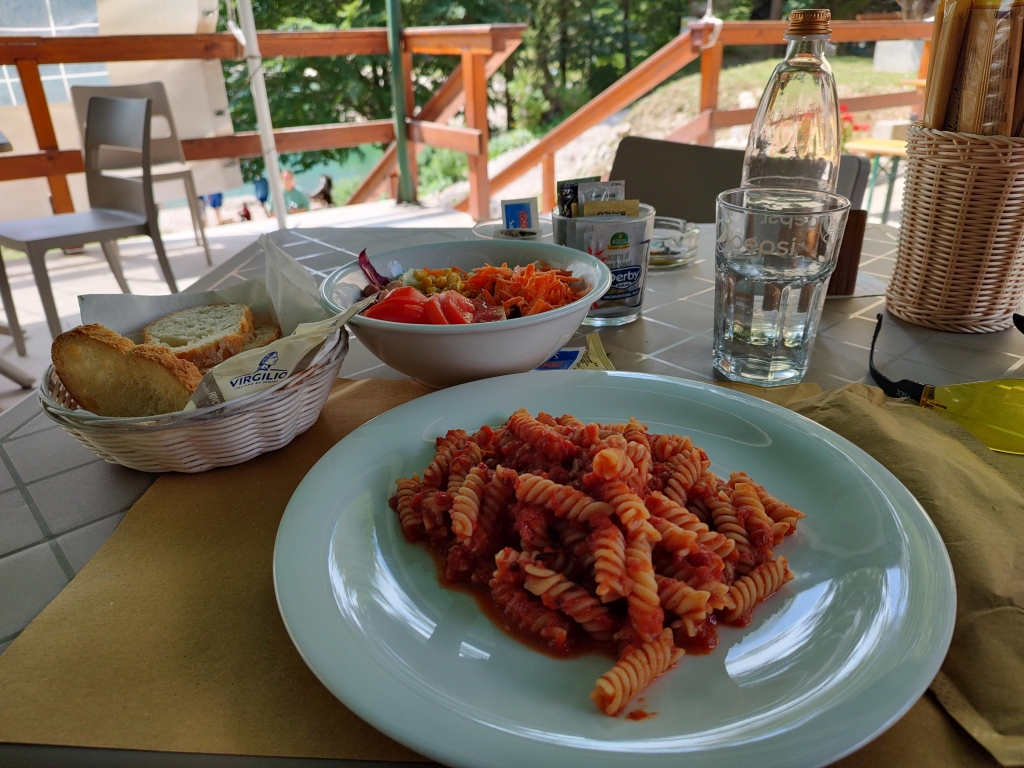 Mittags stoppte ich am Lago di Predil, einerseits um ausgiebig die Schönheit zu bewundern hab , andererseits um meinen Hunger zu stillen. Befürchtete ich zuerst das die Hütte eine Touristenfalle sei, belehrten mich die blau und orange gewandeten Mittagsgäste schnell in einer guten Arbeiterkantine gelandet zu sein.