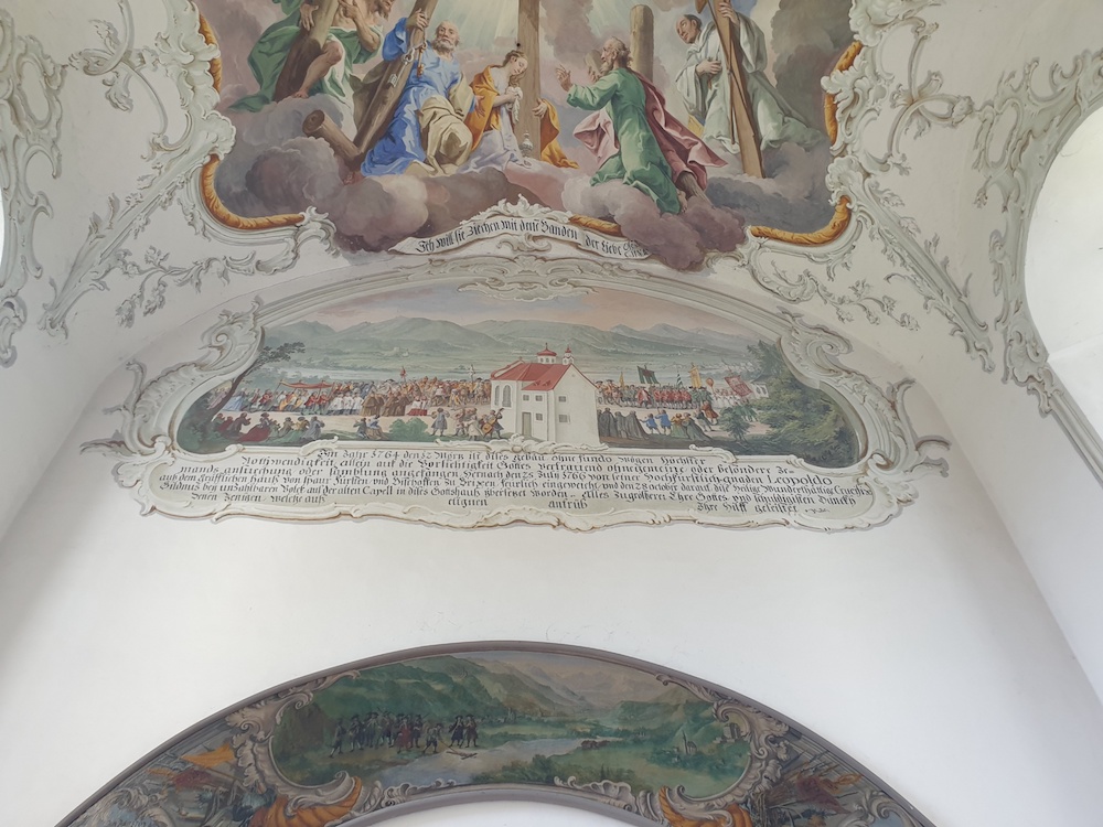 Weiter bin ich Richtung Schwaz, als ich in Pill erstmalig das Kreuzkircherl offen fand. Ich war erstaunt über die hochwertige Malerei, vor allem ab über eine Inschrift:, die ich hier in Auszügen zitieren will: "Im Jahr 1764 [...] ist dises gebäu ohne fundo wögen höchster Nothwendigkeit allein auf die Vorsichtigkeit [gemeint ist Weitsicht] Gottes vertrauend ohne gemeine oder besondere Jemands Ansuchung oder samblung angefangen[...]" Will sagen, man hat dieses Kirchlein, dessen Vorgängerbau bereits baufällig geworden war, ohne dafür ausgewiesene Mittel und auch ohne Genehmigung einfach gebaut. Heute würde das wahrscheinlich sofort wieder abgerissen ...
