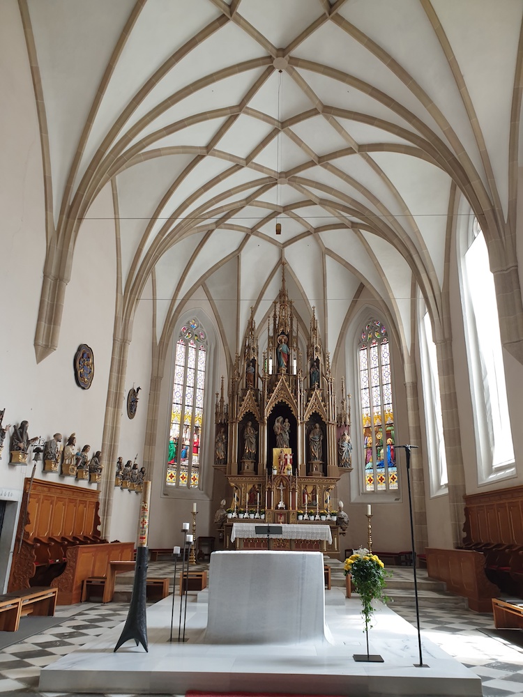 Ja, was soll man sagen? Eine beeindruckende Kirche, die deutlich macht, wieviel Geld im 13. bis 16. Jh. hier verdient wurde. Und die Größe des Multscher-Altars war schon abgestimmt auf den Altarraum, immerhin gut 12 m hoch. Und das kann man auch ann dem heute dort verbauten neugotischen Altar gut erkennen, denn der ist gleich hoch. Und er hat auch einige Figuren des originalen Multscher-Altars eingebaut. Leider konnte man da nicht nah genug hin, um aussagefähige Bilder zu machen. Aber: Man merkt dem Altar eben an, dass er nicht stimmig ist in der Zeit. Dennoch: Wer nach Sterzing kommt, sollte da mal reinschauen. Übersehen kann man das große Bauwerk direkt neben der Deutschordens-Kommende eh nicht. Alle, die zum Penser Joch oder zum Jaufen fahren (oder daher kommen), fahren etwa 200 m südlich daran vorbei.
