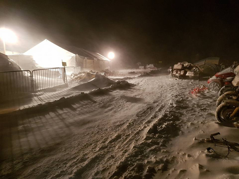Ein geschätzes Drittel der Zelte stehen nicht mehr, ein Typ liegt völlig zugeschneit in seinem zerrissenen Innenzelt, das Aussenzelt hat es weggeweht, und wir rufen und schütteln ihn in der Sorge ob er überhaupt noch lebt. Plötzlich bewegt sich der Schneeberg dann doch und er schaut uns völlig verwundert an. Im grossen Festzelt, in dem die Bar untergebracht ist, sind den ganzen Tag 4-5 Mann beschäftigt, zu verhindern, dass das Ding wegfliegt. Teilweise ist so viel Schnee in der Luft, dass ich nicht von meinem Zelt bis zum Barzelt sehe, das nur 20 m entfernt ist.