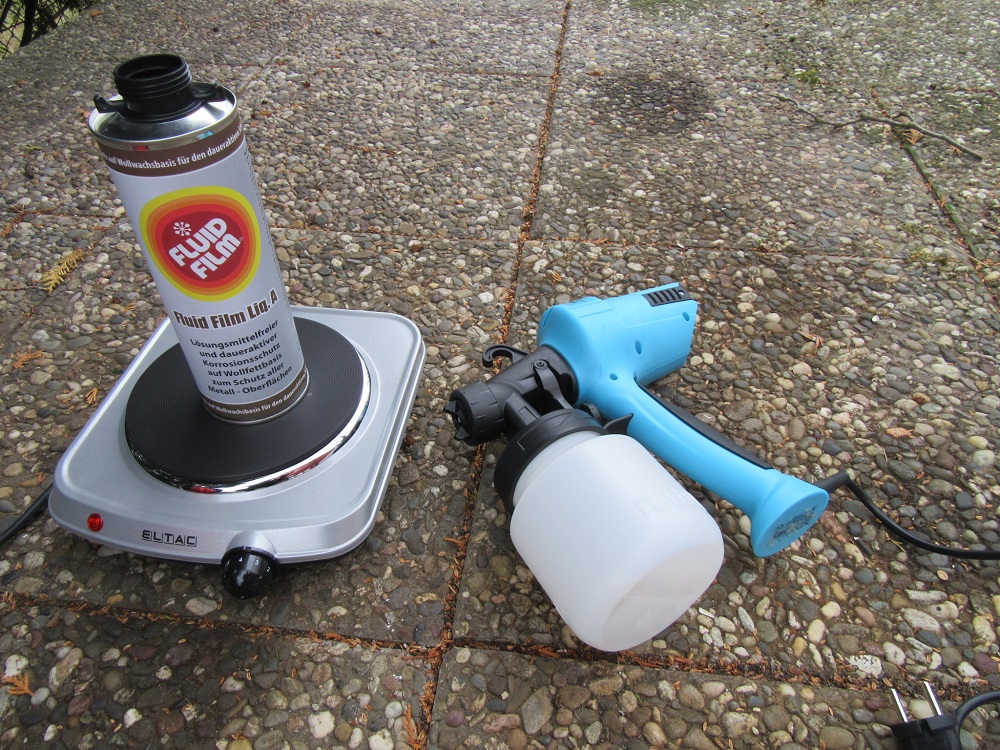 Bilder der ersten F F – „Tauchaktion“ (15.12.2018) :Zwischenzustandsbericht:Für den zweiten Anstrich dampfte ich sie zuvor nicht einmal ab sondern nebelte über bestehende Salzkrusten. Ja – ich weiß… Gewiss nicht das Optimum aber ich wollte bereits bestehende Fluid Film-Schicht nicht in Gefahr bringen…