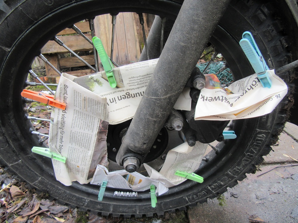 Blöde ist, dass sie (zwei) Scheibenbremsen hat! Diese musste ich vorher mit Zeitungspapier und Wäscheklammern abdecken. Leider bekamen sie doch etwas ab und so war es angesagt, mehrere Tage lang immer wieder die Scheiben zu entfetten…