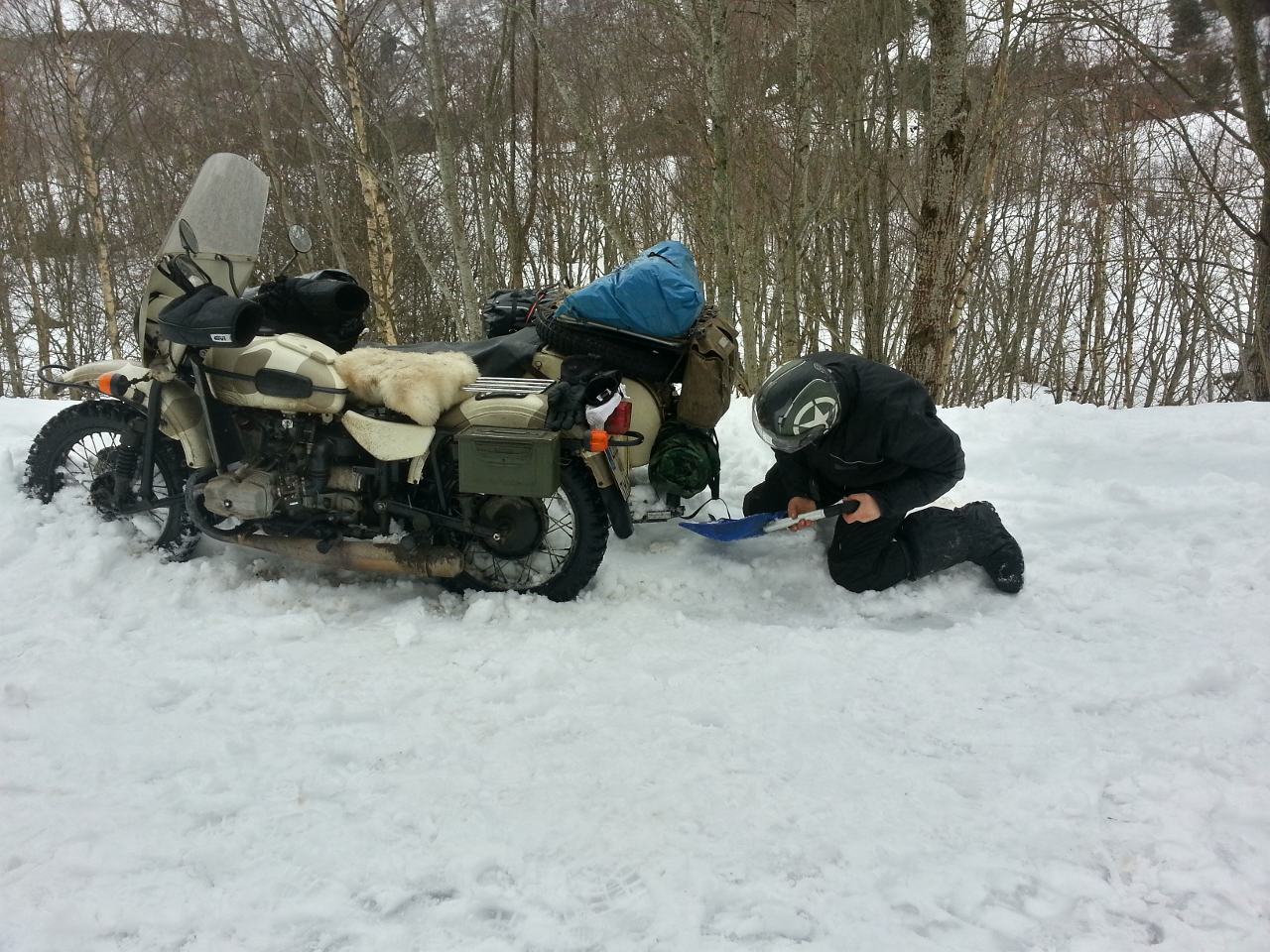 Das taten wir also, und fanden auch einen Weg hoch. Allerdings war der Schnee durchaus eher pappig, weswegen die Emmen nach ca. 50m im tiefen Schnee versackten. Hier half kein Urban Snow mehr, nurnoch brutale Russenpower! Also schoben wir die Emmen ein Stück zurück und setzten uns zu dritt auf den Russenboxer. Mit ein wenig Anlauf und eingeschaltetem Zweiradantrieb ging es in den Schnee. Nun hat so ein gesperrter Zweiradantrieb die Eigenschaft, den Lenker zur bloßen Haltestange zu reduzieren. Kontrolliertes Lenken kann man jedenfalls vergessen. So schossen wir geradeaus den Berg hoch. Dummerweise machte die Straße einen leichten Linksbogen. Was den Russen nicht weiter störte, jedenfalls bis er bis zu den Achsen im Schnee versank. Dann stoppten wir notgedrungen und durften den Brummer aus dem Schnee befreien, was ein paar Anläufe und Versuche dauerte (Nicht lenkbar, man erinnere sich, wir kamen dann rückwärts wieder runter).