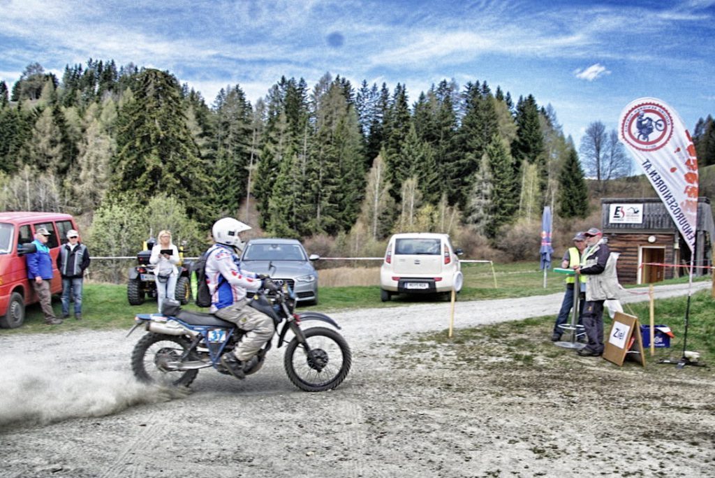 Es gab Mütter, die ihre Kinder den ganzen Vormittag zum Winken an den Zaun hielten. Hofeinfahrten, in denen Biertische aufgestellt waren und bei jeder Runde Wheelies gefordert wurden, und freundliche Streckenposten, die sich auch über mitgeschleifte Bäume freuten. Sogar die Pferde in einer Koppel schreckten sich nicht, sondern schauten, wie ich meine, zumindest interessiert. Der Schmäh lief rund, und Herbert war Sieger der Herzen, weil er an eher unpassenden Stellen seine XT immer zuverlässig und zeitnah ankickte. Auch ihm wurde eine Dose Bremsenreiniger überreicht.