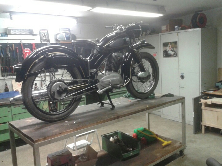 Ich hebe das Motorrad an und fahre dann mein Gestell darunter unten habe ich noch eine ablage für abgeschraubte Teile.