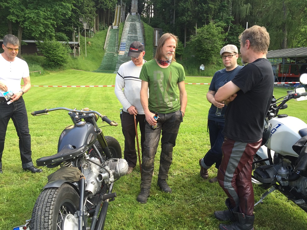 Kurz nach zwölf fließender Übergang zu de Weißwürscht im Obstgarten, bei strahlenden Sonnenschein, schließlich auf zum Betriebsausflug, nach Auerbach bei Wartenberg zum Italienertreff, im kleinen Kreis scheene Mopeds Glems-Eck-Renner mit Straßen Zulassung, cool was so alles geht, viele tolle Gespräche neue Kontakte alte Gesichter tolle Geschichten alles sehr familär, einfach schee, Danke Christian, super Idee, was se der gfreut hat weil lsei Guzzi wida so schee lafft , der passt a auf koa anders Moped drauf die ist wia für ihn wia gemacht, ein Guß schee zum zuschaugn von meinem Logenplatz aus, grins. Kuscheln unter dem Dach von der Skvereinshütten mit TRaition und Geschichte und kleinem Museum um zu zu schaugn wie die Wiese auf der die Mopeds standen langsam zum See umgeformt wird des alles unter einer 5.fach Skischanze mitten in Oberbayern. Kaum spielt die Rock Live Band ist das schlechte Wetter um Nuancen heller. Wie immer ein schöner Tag. Beim Treffen stießen noch Guzziwoida und Andy mit seiner BMW-Eigenkreation dazu.