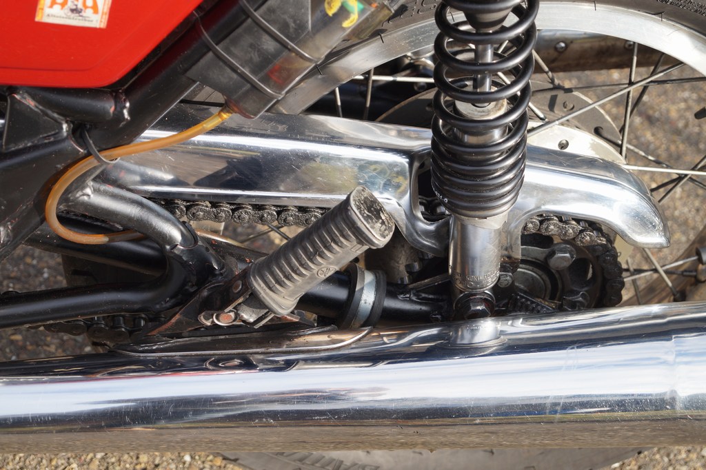 Gabel, Vorderbremse und Instrumente von '77er Modell. War schon bei meinem Kauf in '92 so, daher kann ich den Gesamtkilometerstand nicht angeben. Fahrzeug läuft sauber geradeaus, Unfallschaden kann ich daher ausschließen