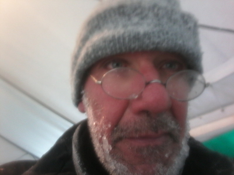Ein geschätzes Drittel der Zelte stehen nicht mehr, ein Typ liegt völlig zugeschneit in seinem zerrissenen Innenzelt, das Aussenzelt hat es weggeweht, und wir rufen und schütteln ihn in der Sorge ob er überhaupt noch lebt. Plötzlich bewegt sich der Schneeberg dann doch und er schaut uns völlig verwundert an. Im grossen Festzelt, in dem die Bar untergebracht ist, sind den ganzen Tag 4-5 Mann beschäftigt, zu verhindern, dass das Ding wegfliegt. Teilweise ist so viel Schnee in der Luft, dass ich nicht von meinem Zelt bis zum Barzelt sehe, das nur 20 m entfernt ist.