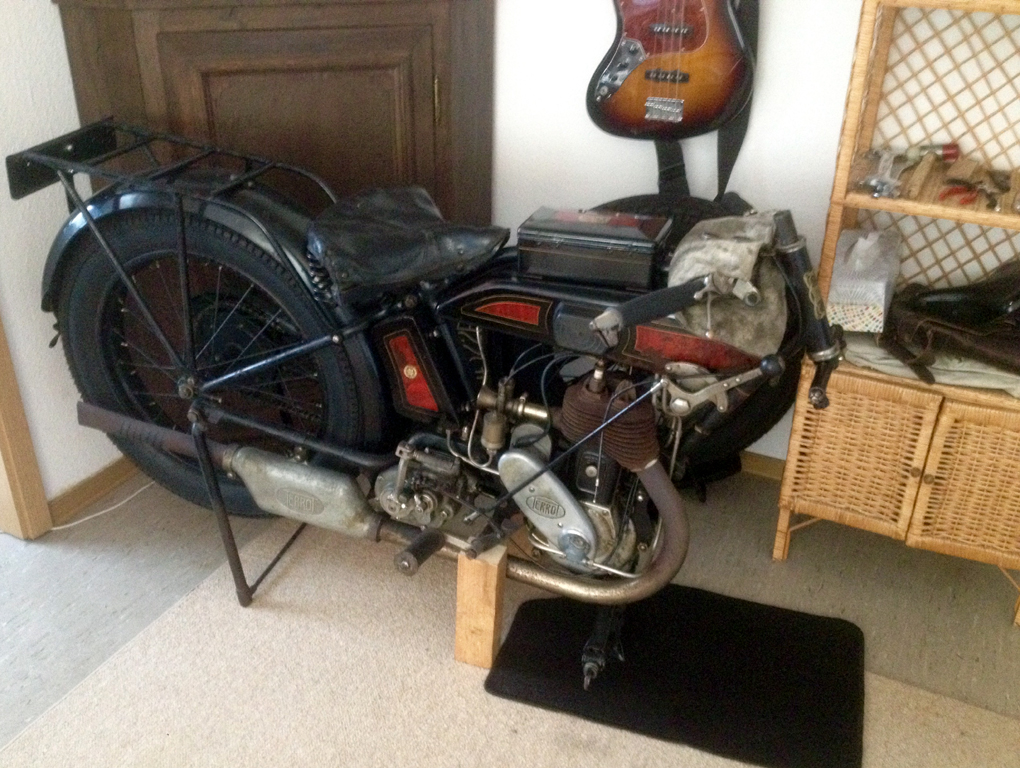 Tank + Öltank zur Aufarbeitung demontiert. Beifahrerfußrasten und Sozius nach langem Hadern ("DER ORIGINALZUSTAND! FREVEL!") abgeschraubt und eingelagert, ebenso das originale, beleuchtete französische "Nummernschild", an dessen Stelle irgendwann ein deutsches kommen soll. Die Linienführung gefällt mir jetzt besser, und mit ca. 9 PS sowie den zeitgemäßen Verzögerungseinrichtungen werde ich mich hüten, jemanden mitzunehmen.