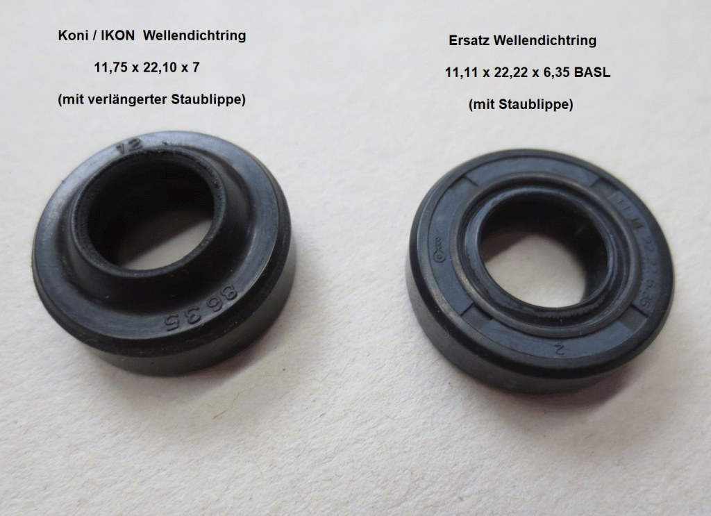 Der Knackpunkt ist das 11,75 mm Mass der Koni Kolbenstange. Da gibt es nur wenig Auswahl bei den Dichtringen. Mein erster Gedanke war, es mit Nutringen oder Stangendichtungen zu versuchen. Die Teile werden in der Hydraulik zum Abdichten von Kolbenstangen eingesetzt und sind in 11,2 x 19,2 x 5 oder 11,2 x 21,8 x 8 zu bekommen. Die Überlegung ist aber erstmal mal wieder zurückgestellt. Die Nutringe brauchen wohl, wenn ich es richtig verstanden habe, einen gewissen Vordruck damit sich die Dichtlippen richtig anlegen. Die Konis sind aber von der Konstruktion her Innen Drucklos.