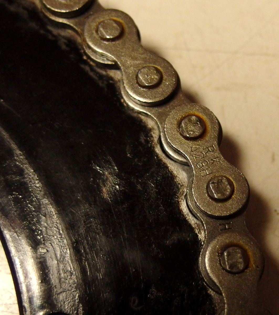 Die Probe mit aufgelegter, neuer 428er Kette zeigt - meiner Meinung nach - dass die Ritzel tatsächlich noch ganz in Ordnung sind.