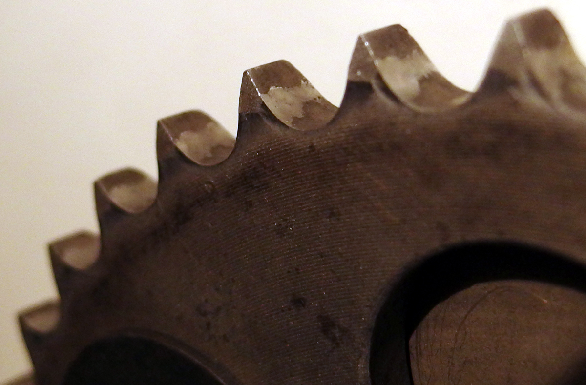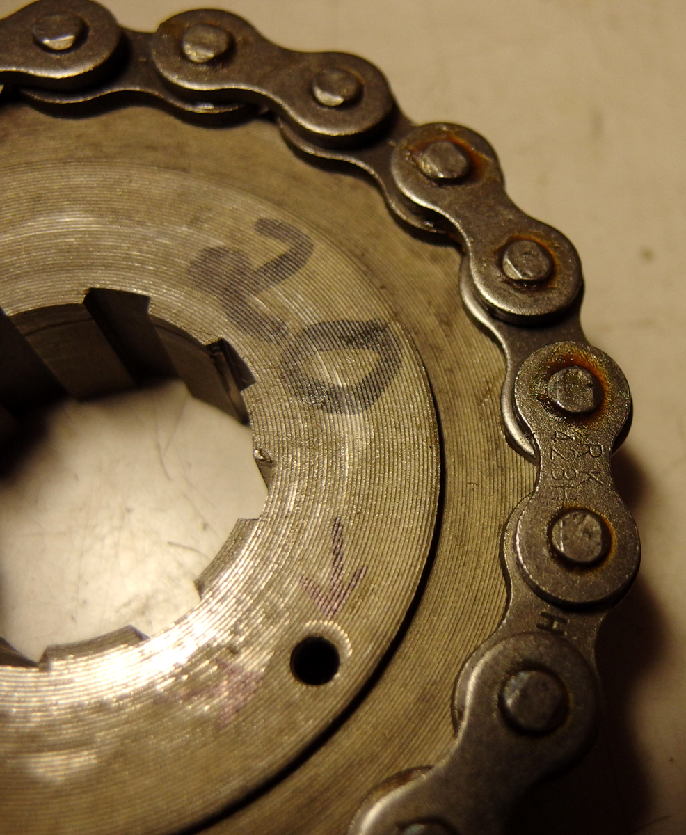 Die Probe mit aufgelegter, neuer 428er Kette zeigt - meiner Meinung nach - dass die Ritzel tatsächlich noch ganz in Ordnung sind.