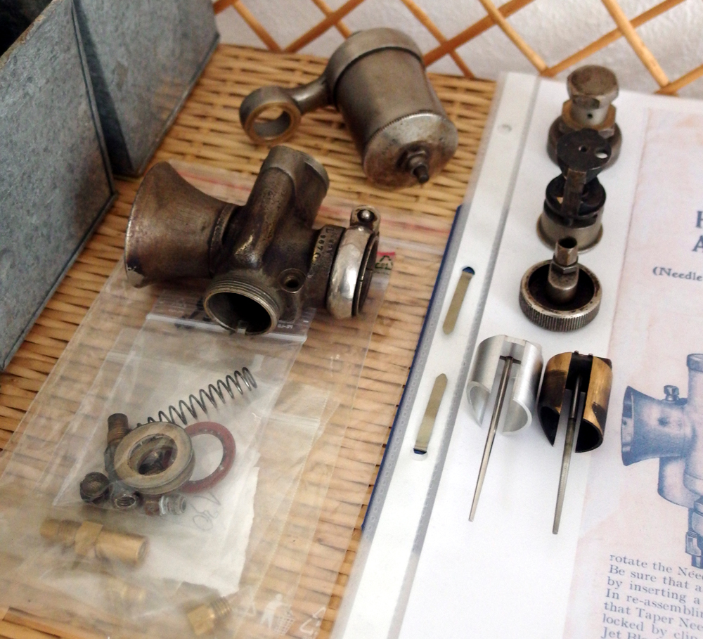 Hier liegen jetzt ein ausgespindeltes Vergasergehäuse, ein Übermaßgasschieber aus Alu und diverse neue Vergaserinnereien.