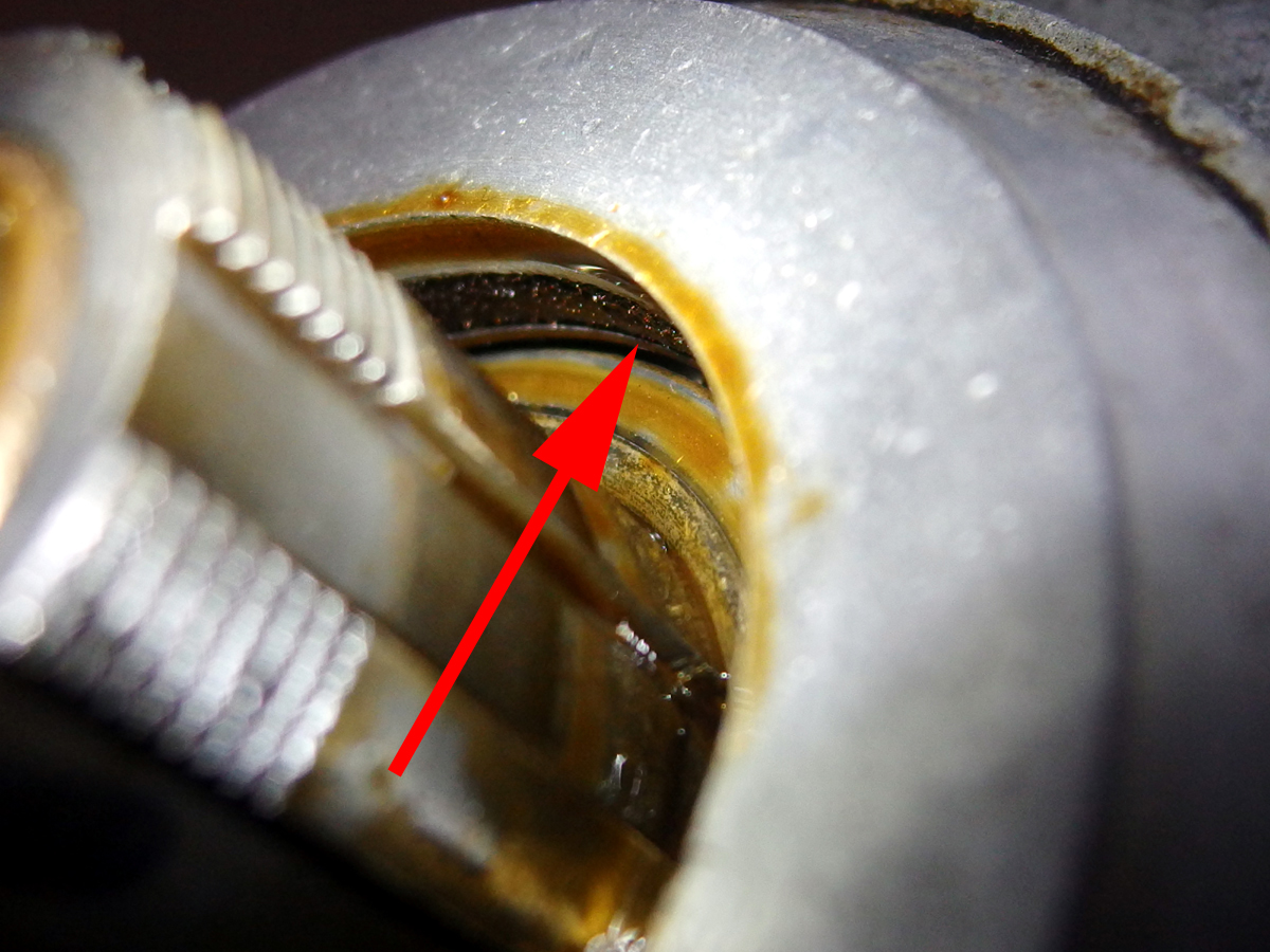 Es wurde ja vermutet, dass die Scheibe der Ausdistanzierung des Primärtriebs dient. Das ist zumindest nicht ihre wesentliche Aufgabe. Laut ET-Liste ist sie eine "tiefgezogene Blechscheibe zum Abdichten des Öls der Ritzelwelle". Nur, dass diese Scheibe jetzt bei mir aus zwei Teilen besteht... :omg: Der eine Teil klebt am Filzdichtring (siehe roter Pfeil, Bild 2), der andere Teil sitzt hinterm Ritzel, und der Teil, der beide Scheiben miteinander verband, hat sich in über 90 Jahren in Luft aufgelöst.