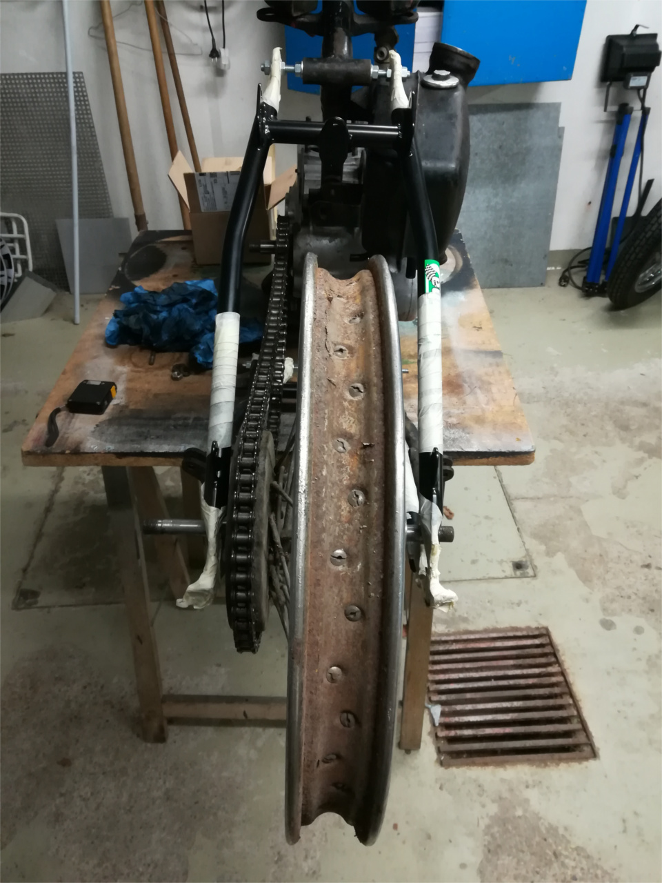 Ein paar Garagenbier sei Dank! Quasi ein Geistesblitz. Speedwaymaschinen fahren heute noch Starrrahmen mit 19" Hinterrad. Die Frima Stuha zb. stellt solche Heckrahmen auch einzeln her.