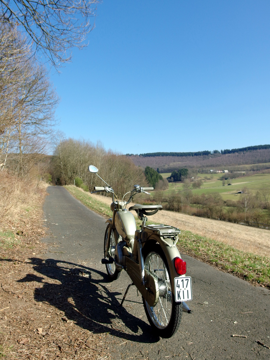 Aber das waren keine kleinen Fluchten... Mein Ausflug mit dem Moped Anfang vorletzten Jahres geht eher in die Richtung. Die Zündapp Bergsteiger der Oma meiner Freundin wieder fitgemacht, angemeldet und einen Tag lang mit allerhöchstens 40 km/h die kleinen Straßen und Feldwege abgegrast. Viel Zeit, um beim Fahren die Gedanken wandern zu lassen und die Landschaft in Zeitlupe an sich vorbeiziehen zu sehen.