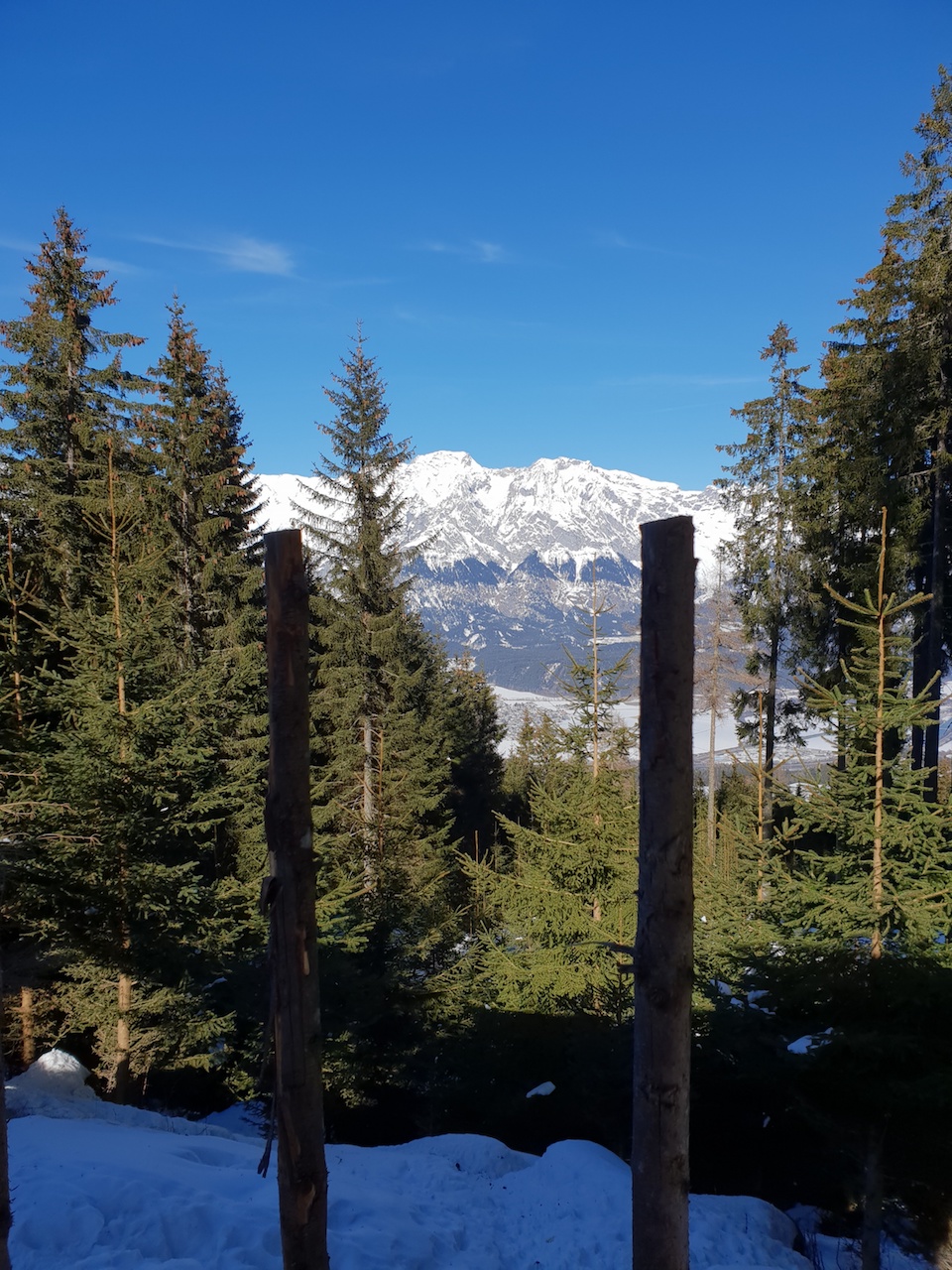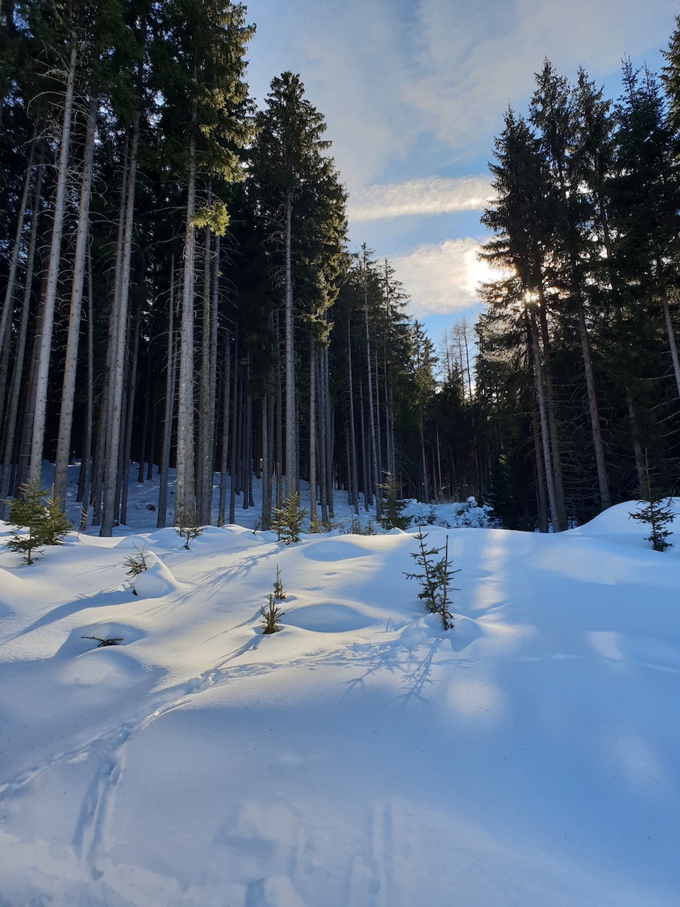 Ich bin heute bei strahlendem Sonnenschein durch das verschneite Winterwonderland ins Revier hinaufgelaufen, um die Fütterung wieder zu befüllen. 500 Höhenmeter in einer Stunde - geht also noch.