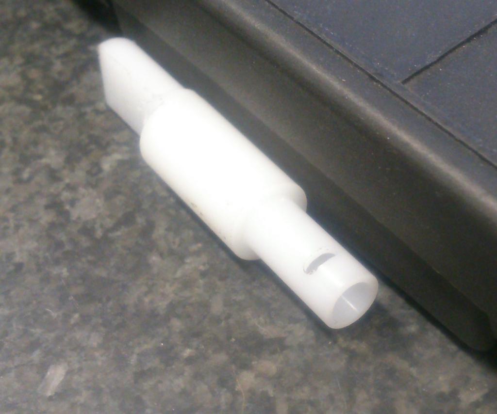 Das ist die Gedrehte, gebohrte und mit Langloch versehene POM-Hülse für den Ø6mm Messingnippel. Aussendurchmesser entspricht den 8,5mm die die Aufnahmebohrung im Handhebel hat, innen sinds 6,1mm, das Langloch mittels 2,5er Fräser gefertigt. Beim Ziehen des Hebels sitzt der Kunststoff fest im Hebel, der Nippel dreht sich darin um ein paar Winkelgrade. Die Reibung zwischen POM und Messing ist geringer, als zw. Messing und dem Alu des Griffes, auch wenn das Ganze mal dreckig wird. Originalerweise ist das auch so.