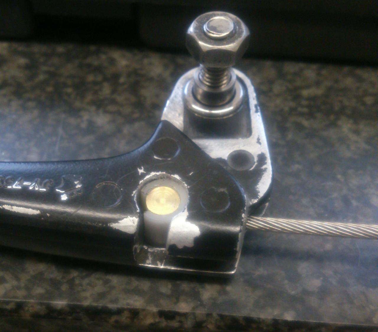 Das ist die Gedrehte, gebohrte und mit Langloch versehene POM-Hülse für den Ø6mm Messingnippel. Aussendurchmesser entspricht den 8,5mm die die Aufnahmebohrung im Handhebel hat, innen sinds 6,1mm, das Langloch mittels 2,5er Fräser gefertigt. Beim Ziehen des Hebels sitzt der Kunststoff fest im Hebel, der Nippel dreht sich darin um ein paar Winkelgrade. Die Reibung zwischen POM und Messing ist geringer, als zw. Messing und dem Alu des Griffes, auch wenn das Ganze mal dreckig wird. Originalerweise ist das auch so.