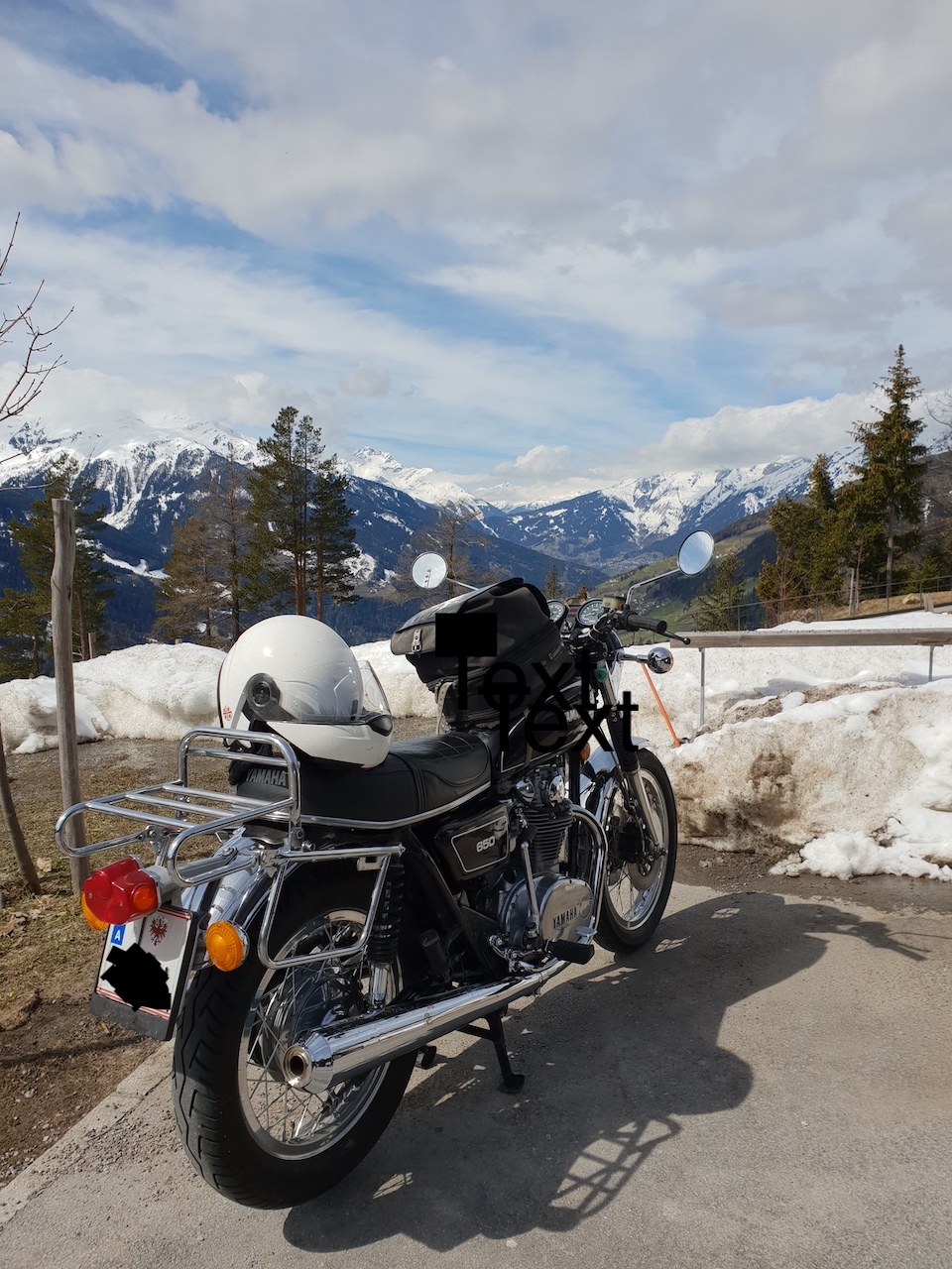 Die XS sieht seltsam modern aus vor dem verwitterten Holz, dem Gemäuer, den schneebedeckten Gipfeln.