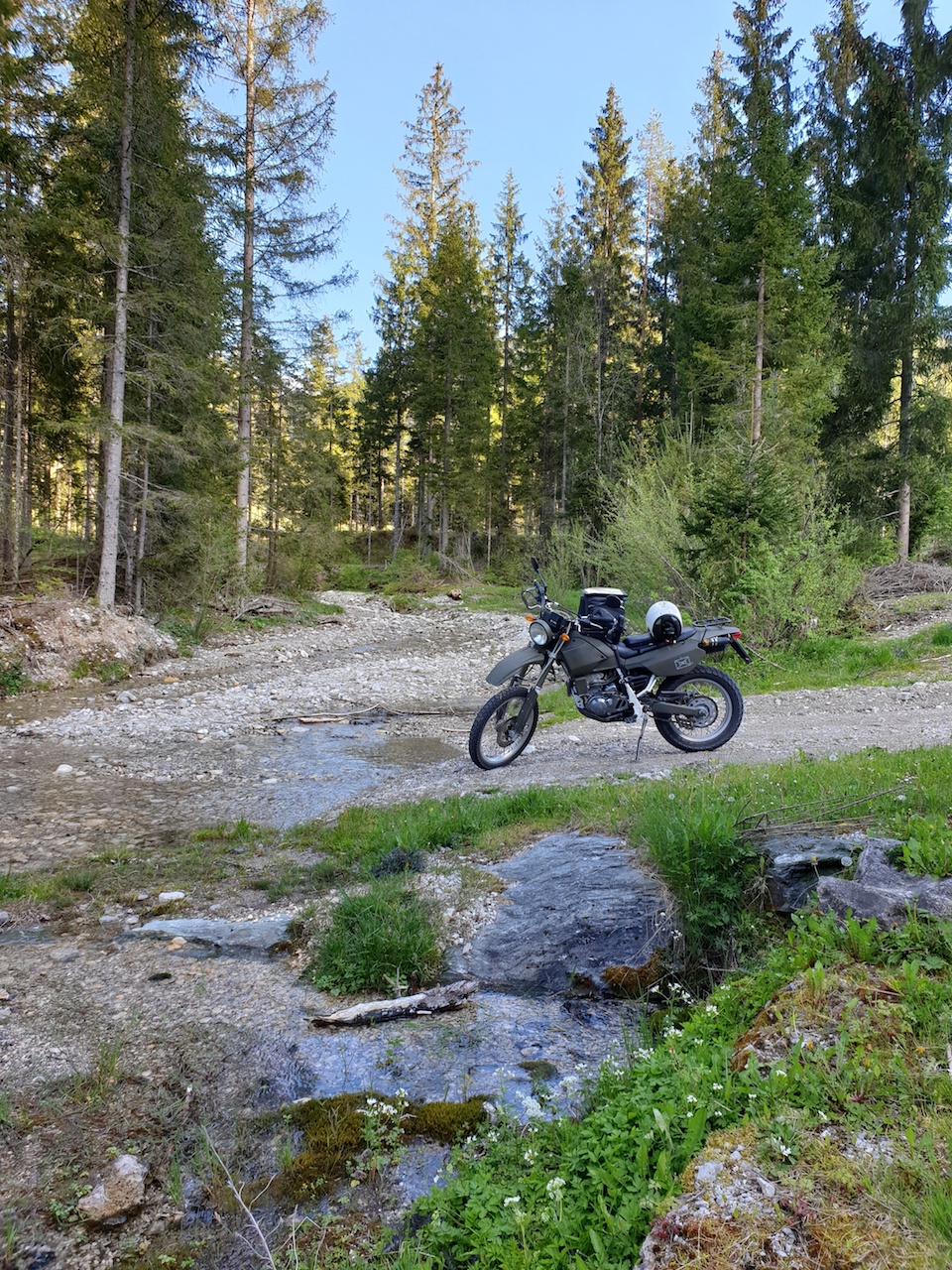 Gegen 1400 Uhr bin ich los, das Rosental Richtung Ferlach (einige mögen sich noch zweier Museumsbesuche dort entsinnen). Das Gewölk entwickelte sich lebendig, aber bis Feistritz blieb ich trocken. Dort habe ich mich nach Süden ins Bärental verrollt. Ein enges und schönes Tal, wildromantisch, das zum Ende der legalen Strecke sogar noch ein paar Kilometer Schotter beinhaltete. Nur hatte ich den Regen eingeholt und Ross und Reiter wurden ziemlich eingesaut. Macht ja eh niXS...