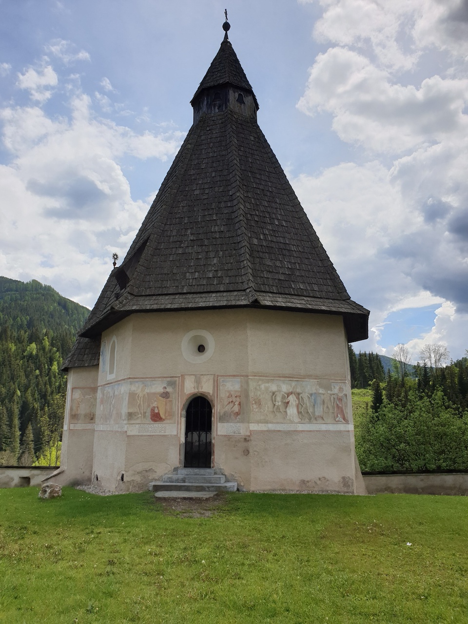 Punkt 1000 Uhr am Stadtplatz in ein Cafè eingerückt und erstmals gefrühstückt. Dann 2 h in Sachen Museumsbegutachtung verbraten, um dann von Murau über Grabenberg ins Auental (keine Hobbits gesehen, sieht aber ähnlich aus!) und weiter in den Wöbringraben. Allein, schönes Wetter und weil ich mich am östlichen Ufer dann auf eine kleine Nebenstraße verrollte, gab es noch ein paar km Schotter obendrauf. Im Metnitztal angekommen bin ich im gleichnamigen Ort den berühmten Totentanz anzusehen. Wirklich sehenswert!