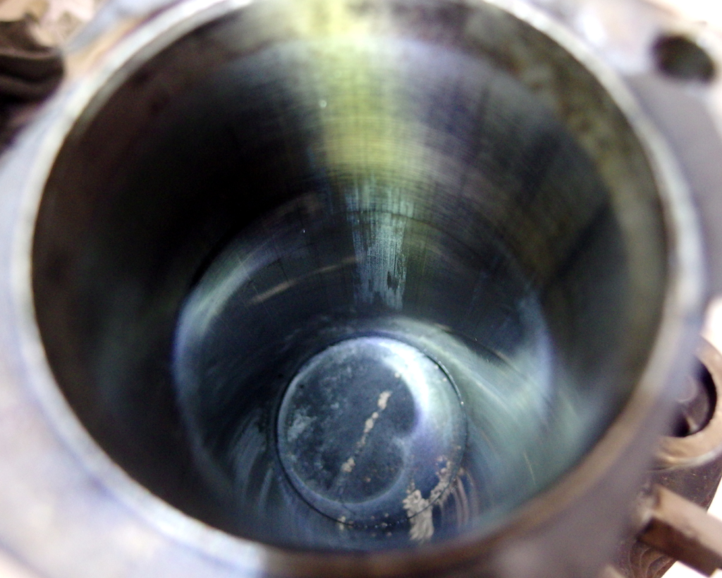 scheint nur gedreht nicht mal gehont zu sein, noch dazu wellig, oder man müßte gucken ob der Zylinder in diesen Bereichen Rippen hat, an denen der Zylinder hier bei Hitze nach innen gewachsen ist.