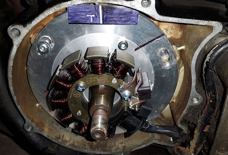 Da das PD-Polrad deutlich kleiner ist als das Originale, ist in alle Richtungen etwa 1 cm mehr Platz unter dem Polraddeckel. Ich wollte daher die Zündung unter dem originalen Polraddeckel verbauen. Da rechts oben wo die Halteschraube an der Grundplatte fehlt, soll die Lichtschranke hin: - Geberscheibe anfertigen und am Polrad befestigen
