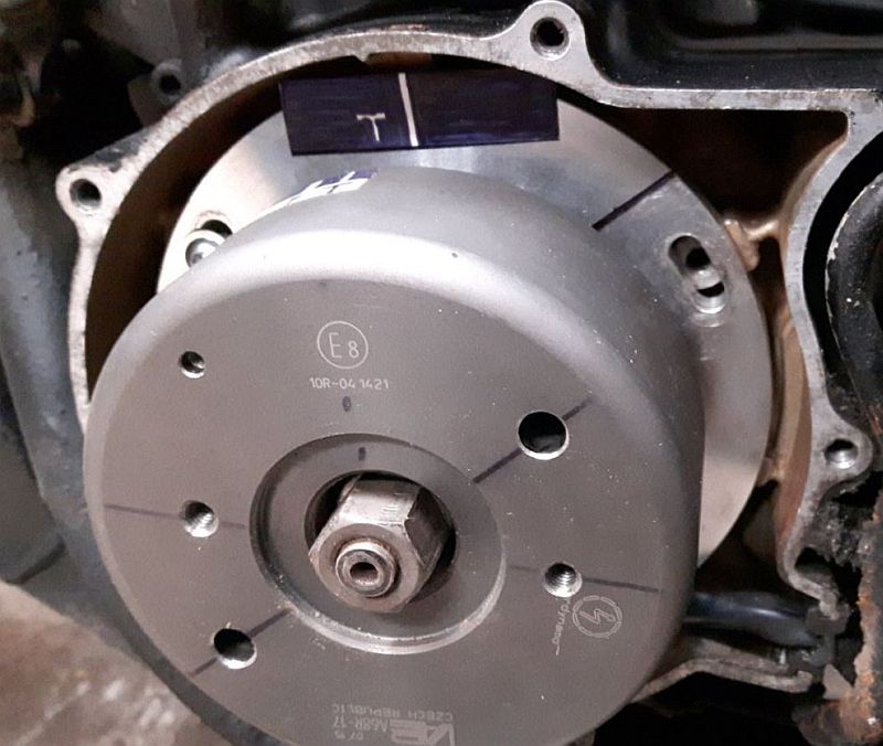 Da das PD-Polrad deutlich kleiner ist als das Originale, ist in alle Richtungen etwa 1 cm mehr Platz unter dem Polraddeckel. Ich wollte daher die Zündung unter dem originalen Polraddeckel verbauen. Da rechts oben wo die Halteschraube an der Grundplatte fehlt, soll die Lichtschranke hin: - Geberscheibe anfertigen und am Polrad befestigen