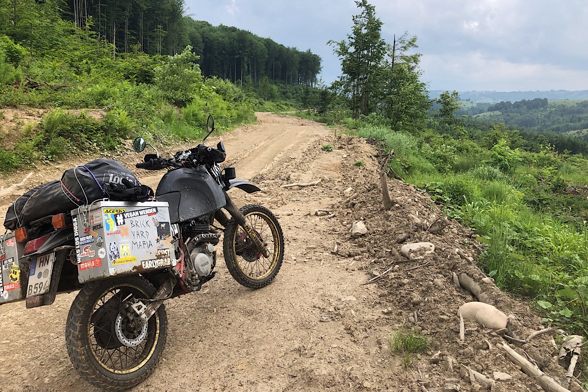 Nach Temeswar bin ich südlich Richtung Reschitza gefahren in einen Nationalpark. Auf dem Berg wollte ich dann eine kleine Abkürzung durch den Wald nehmen, jedoch musste ich nach 12km umdrehen, da die Straßen teilweise 40cm unter Wasser standen alles voll mit Matsch und Schlamm war. Die Spurrillen wurden irgendwann so tief, dass ich nicht mehr mit meinen Koffern druchgepasst hätte. Nach zwei kleinen Stürzen habe ich dann umgedreht aber es trotzdem nen heiden Spaß gemacht, auch wenn es der Kette nicht sonderlich gut getan hat