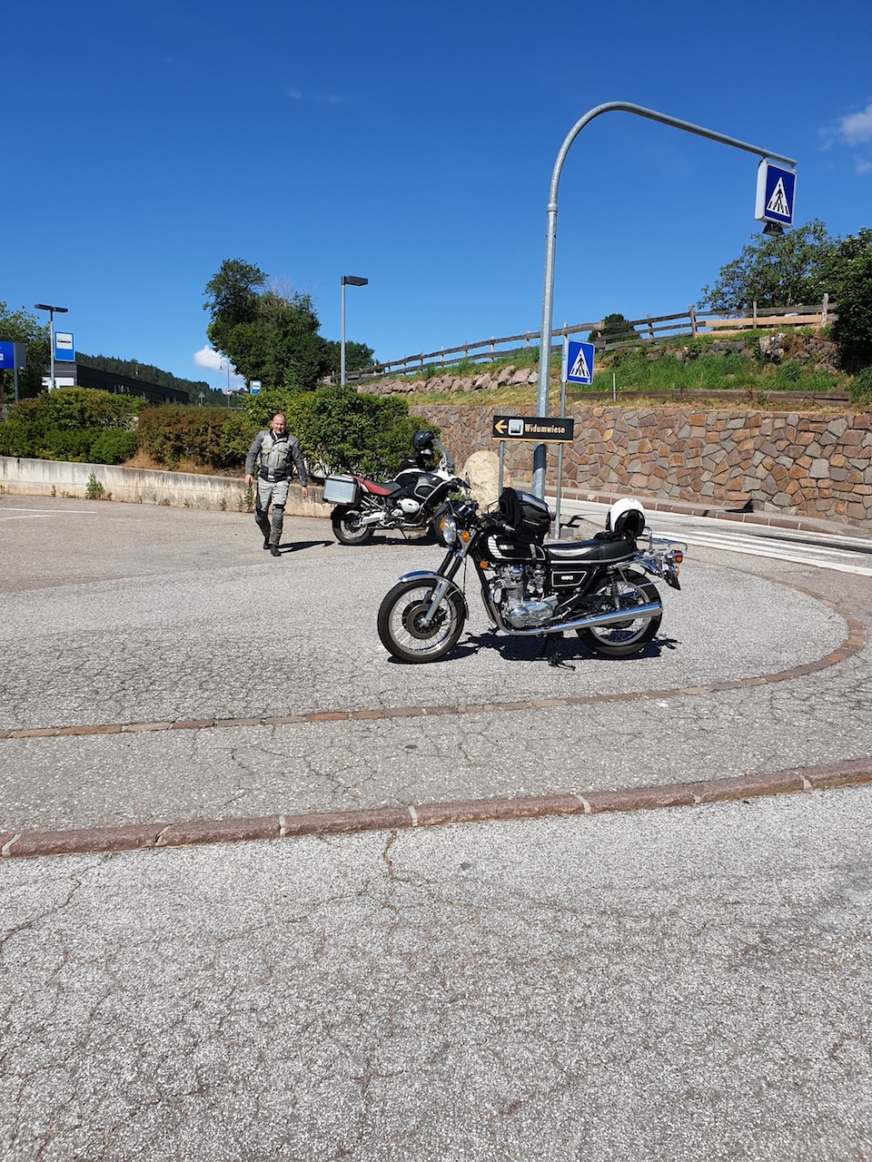 Dnn wieder zurück über den Brenner, wo ich mit einer Husqvarna (70 PS, wie mir der Knabe stolz sagte) kaum Schritt halten konnte. Hallo, das war eine Hatz! Die jedoch jäh am Beginn der auf 50 km/h beschränkten Strecke (der sogenannten "alten Brennerstraße", die aber erst 1840 heerum angelegt wurde) endete, weil mein Kupplungszug gerissen war.
