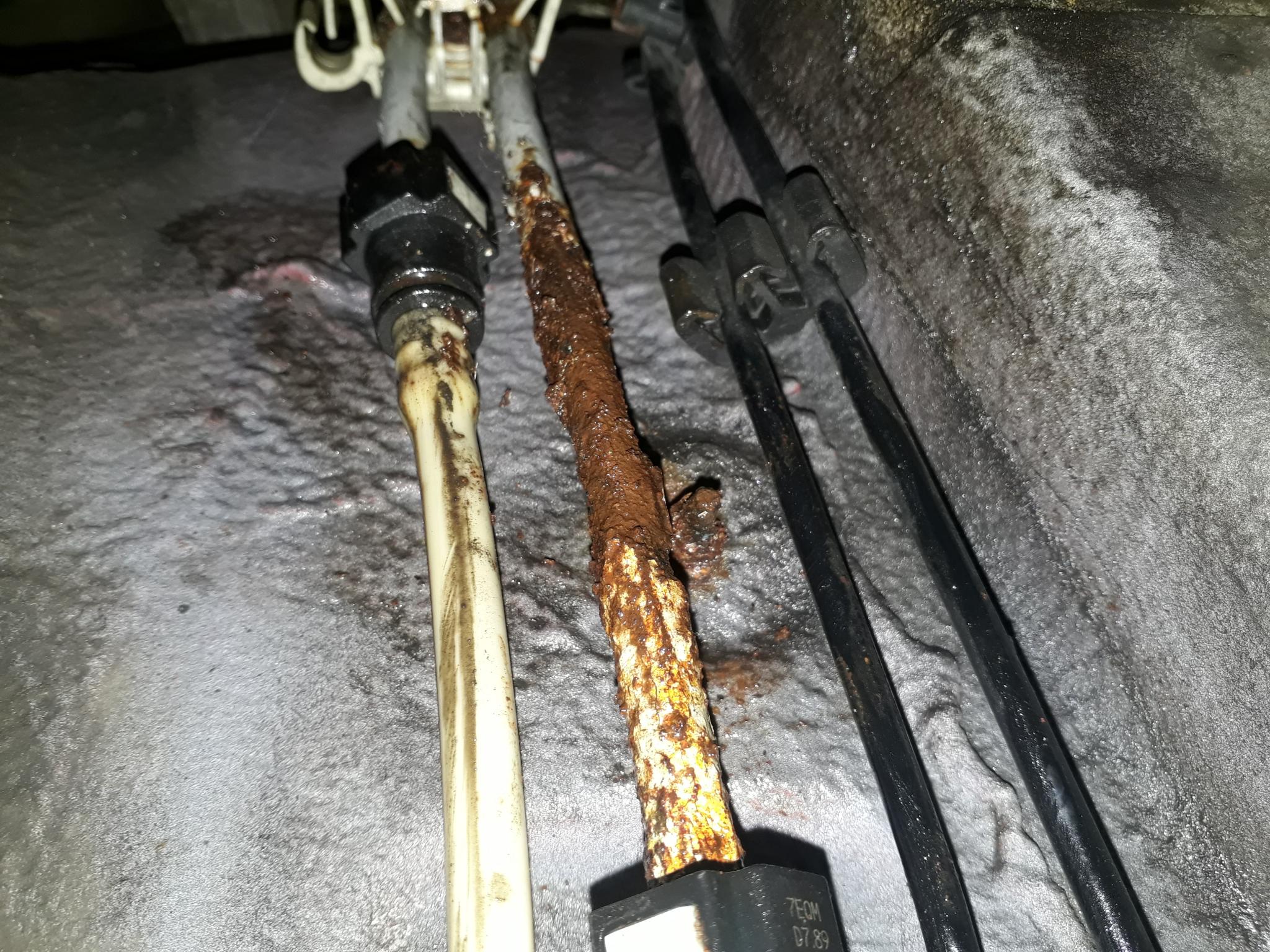 Auto aufgehoben, Kunststoff runter, die Misere lokalisiert, 20cm durchgerostetes Röhrl rausgeschnitten, einen Schlauch geholt und eingebaut. Jetzt hängt er am Ladegerät, weil er nimmer will. Hoff der Schas is dicht, der Doblo muß da weg. Muß die Kontamination beseitigen...und packen