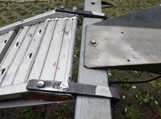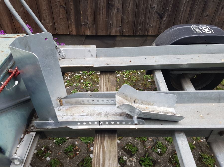 1) :check: Die Aluhaken wurden abgesägt und durch stabile, wesentlich weiter oben angesetzte Haken aus Bandstahl ersetzt, Funktioniert. Die Rampe sitzt tiefer am Anhänger, und es geht barrierefrei dahin.