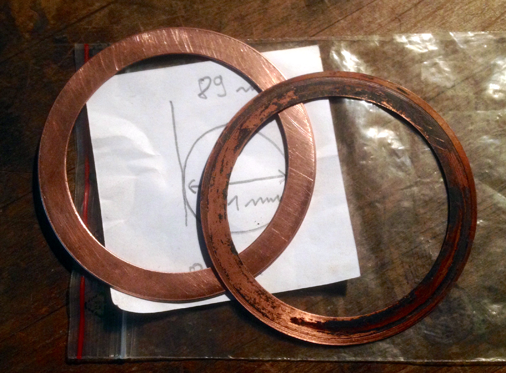 Vielleicht gehört die auch schmaler. Auf der Explosionszeichnung des Motors sieht sie aber schon so breit aus. :gruebel: Zu kaufen gibt es meiner Recherche nach nur "in etwa" passende Dichtungen, und da ich noch Kupferblech hatte...