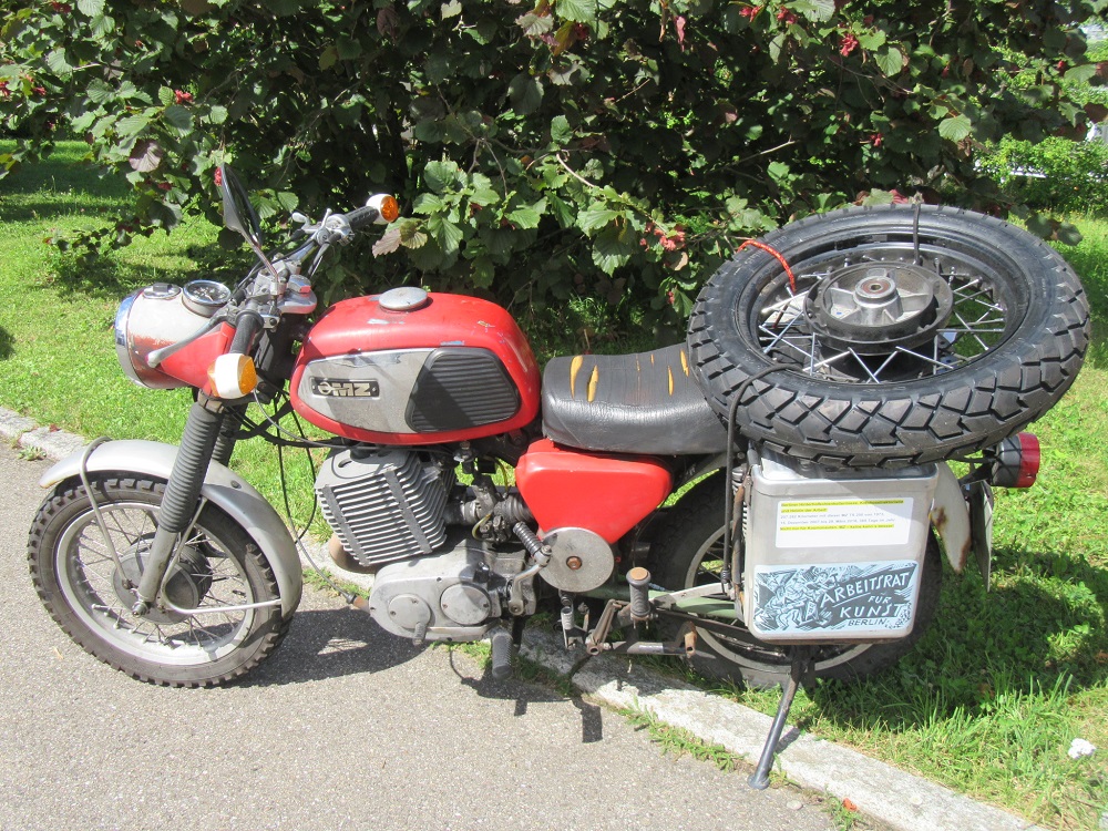 Am Morgen mit der MZ TS 250 zur beruflichen Arbeit und am Nachmittag das Hinterrad abgeholt. Wie war das schön, mit diesem kleinen quirligen Motorrädle wieder zu fahren. Wenn nur der Motor nicht so bockfertig wäre. Ist ja der vierte Motor aus der "Dauertest-Ära" und der hat über 70.000 Km runter, auch Kolben und Zylinder.