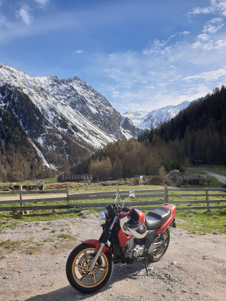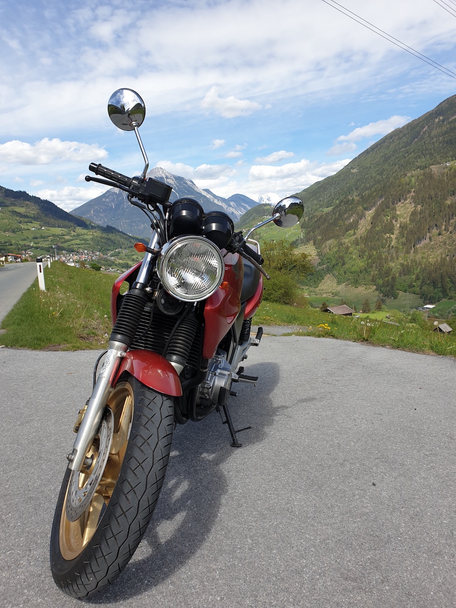 Marinus hat heute die Luise-Honda nach Südtirol getrieben: über Brenner und Penser Joch und weil der Jaufen werktags gesperrt ist, über den Ritten nach Waidbruck und über den Brenner wieder heim. 475km.