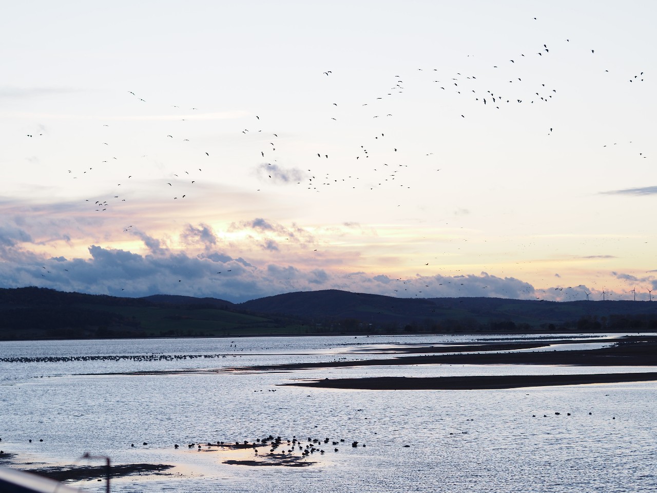 EDIT: das Bild OI...48 irritiert auch etwas, weil im Vordergrund bei der Dämmerung nicht mehr identifizierbare Schwimmvögel kauerten. Weiter hinten ließen sich dann immer mehr Kraniche nieder, im seichten Wasser zum Schutz vor Beutegreifern, welche unter fortwährendem Geschrei überwiegend Richtung Nordost herankamen, manche eben auch aus Süden aus Richtung Josephshof z.B.