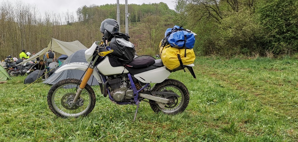 Als ich mit dem DR Gespann unterwegs war, war wegen der Tankform, ein Tankrucksack keine Option. Wohin also mit dem Kleinkram. Die Fahrradtasche ist ein prima Ersatz für einen Tankrucksack.