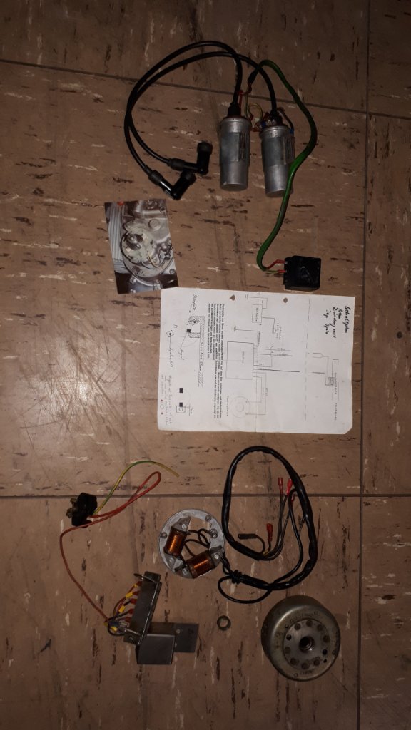 Von den Extrateilen auf'm Bild funktioniert eine Zündspule nicht, die Lichtmaschine ist nicht komplett, bei den 2 Kasteln kann ich net kontrollieren ob se wirklich funktionieren.