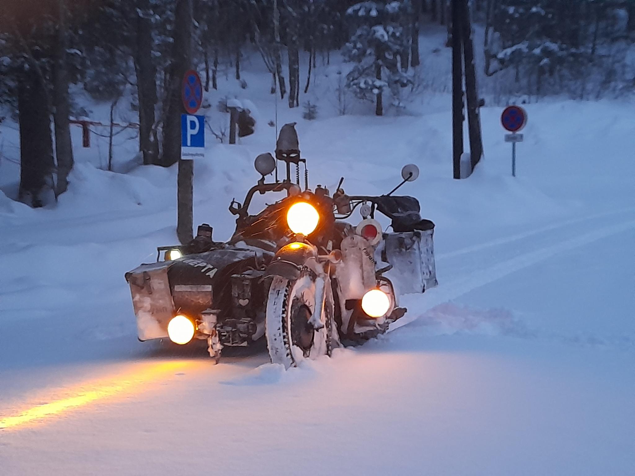 Normalerweise kann ich da natürlich hinauffahren. Aber gegenwärtig ist da 1 m Schnee, der zu einer Piste ausgearbeitet wurde. Wenn ich da mit Ketten hinaufführe, würde ich mir wahrscheinlich nur wenig Freunde machen, vor allem, weil da immer wieder suizidal veranlagte Boarder und Skifahrer herunterbrausen, die ich nicht als Kühlerfigur haben will.